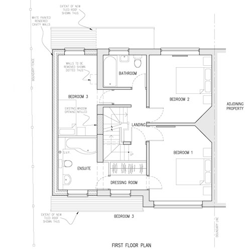 This project, for a two storey side extension, loft conversion and internal alterations, provided my clients with a large open plan, family kitchen, utility room and study, coupled with an additional bedroom with dressing room and two en-suite bathrooms.