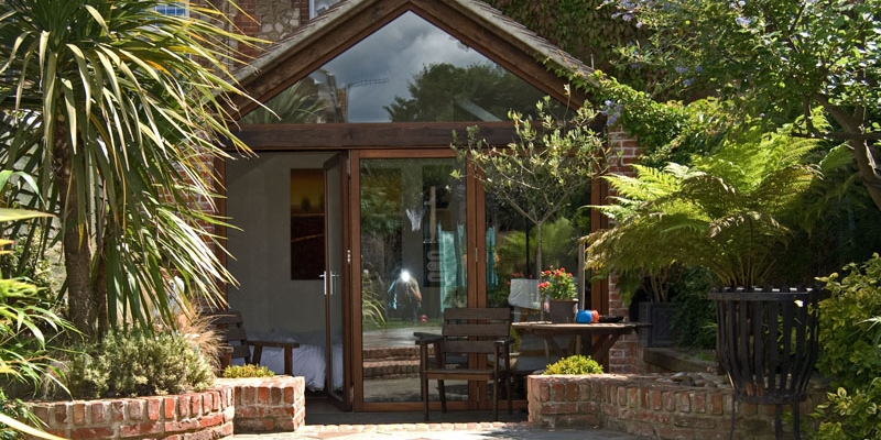The design was fairly contemporary, with the gable end being entirely glazed, with folding / sliding doors.